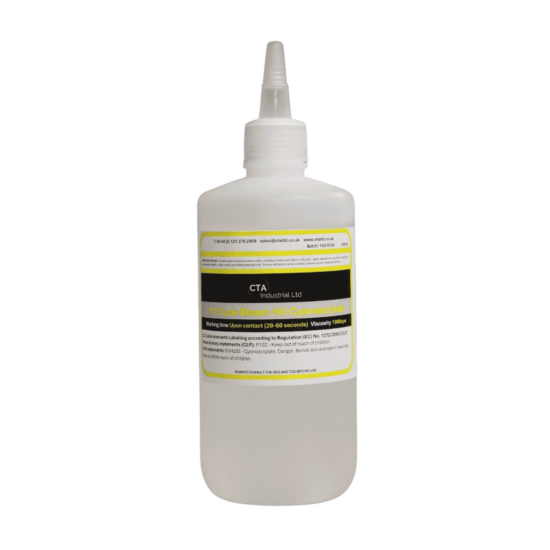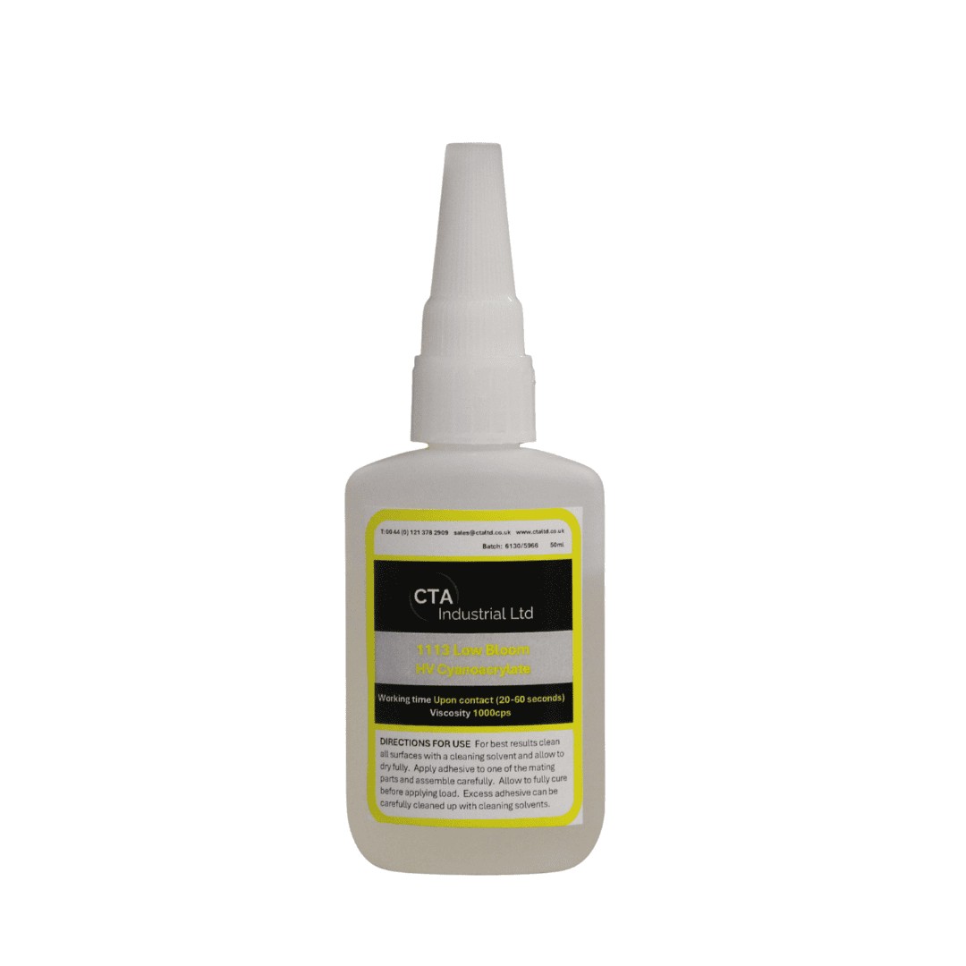 Cyanoacrylate 1113 HV Low Bloom Super Glue is available in 50ml and 500ml. For more information, please contact us. All prices are inclusive of VAT.