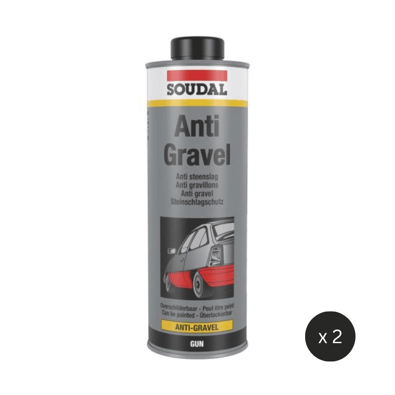 Soudal Anti Gravel Gun is an anti-corrosion protection product for body repair. It is a synthetic rubber–based stone chip protective coating that forms a tough, elastic film protecting against rust, salt, sand, stones, and gravel. The product creates a sound-absorbing protective layer, contains no bitumen or asphalt, can be painted or sprayed, and cures quickly.