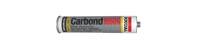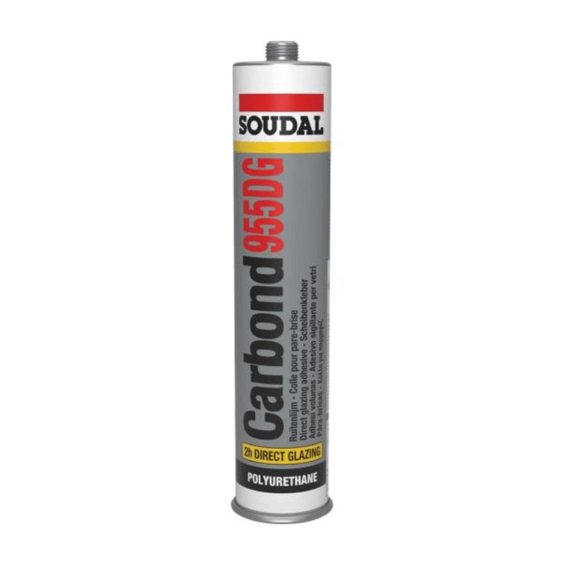 Soudal Carbond 955DG is a PU sealant adhesive for body repair. It is a polyurethane-based, waterproof windscreen adhesive with airbag homologation. The product offers good resistance to sagging, very high end strength, and good colour stability, with resistance to weathering and UV exposure. It has a drive-away time of approximately 3 hours.