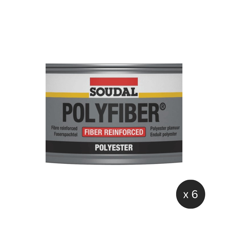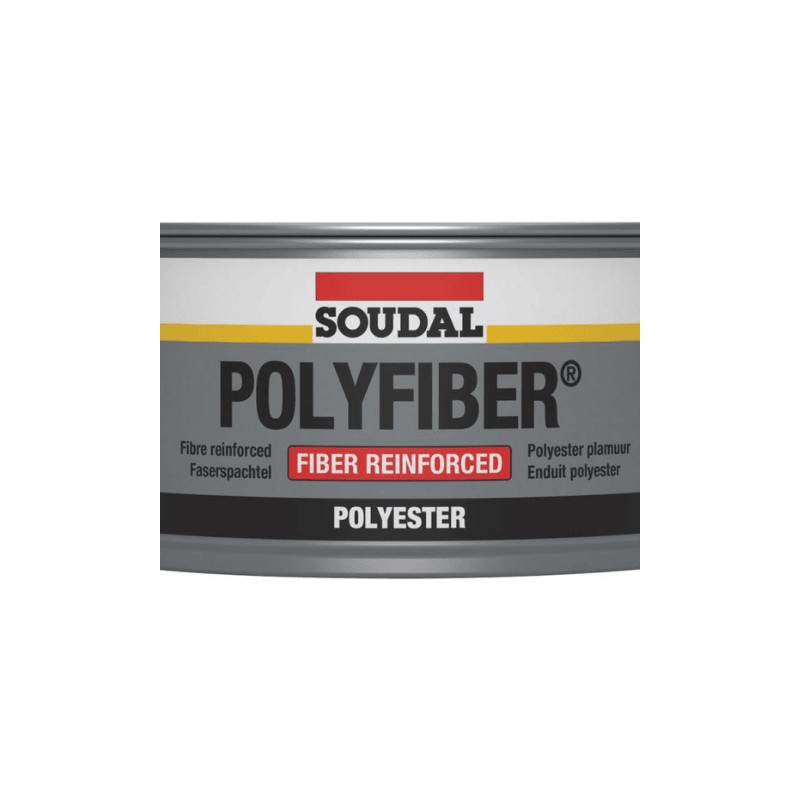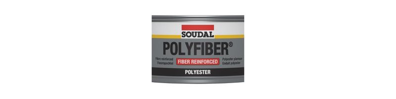 Soudal Polyfiber is a polyester-based filler for body repair. It is a general-purpose, high-quality, glass fibre–reinforced, two-component polyester body filler for repairing damaged surfaces such as dents, scratches, and tears in metal, wood, or polyester. It is very easy to mix and apply, cures quickly, and can be sanded after approximately 20 minutes. The glass fibres provide additional strength to weakened car body parts.
